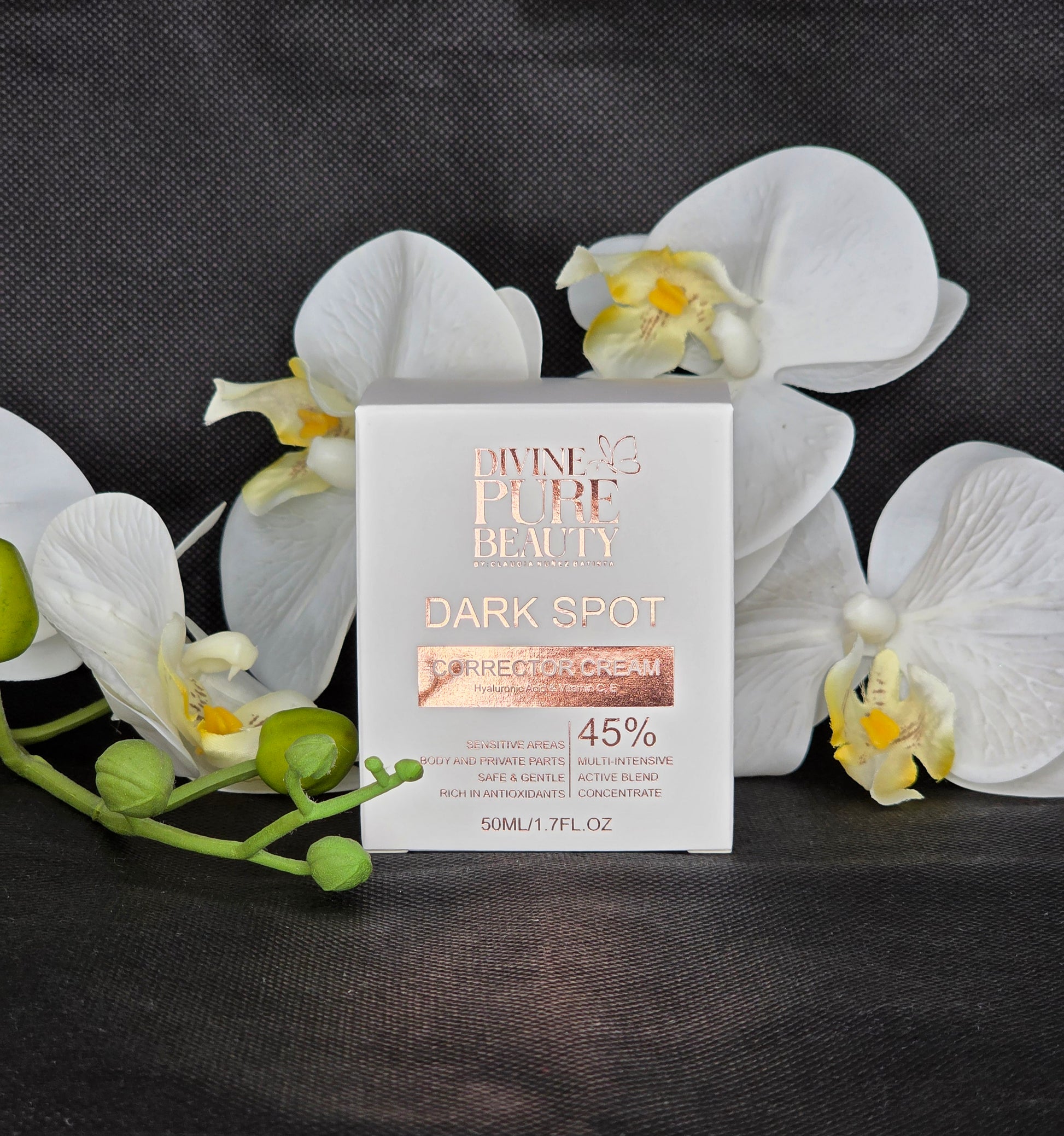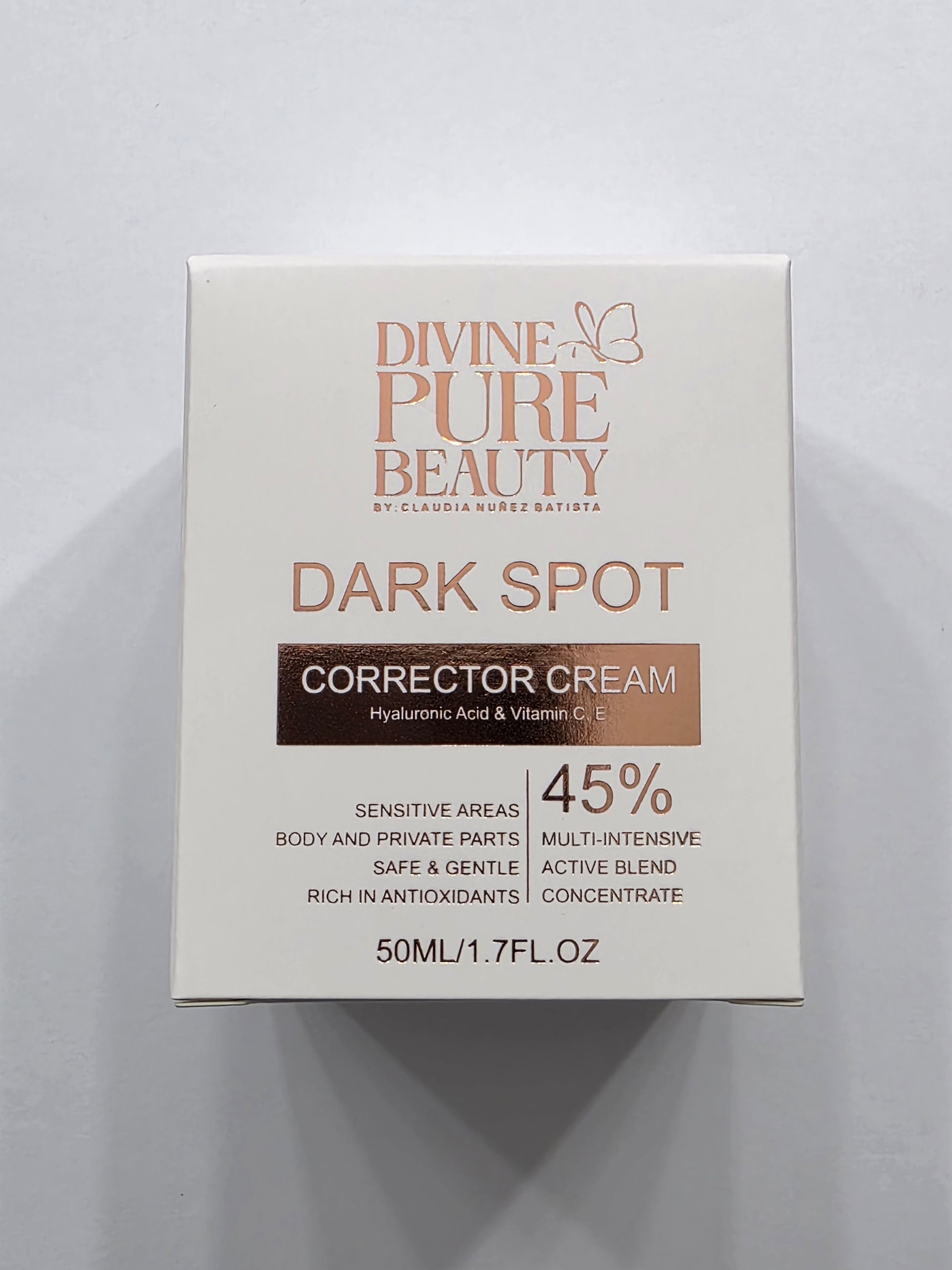 Divine Pure Beauty Dark Spot Corrector Cream features a refined formula designed to gently diminish dark spots anywhere on the body. Enriched with antioxidants and vitamins C and E, it supports a clearer, more radiant complexion while nourishing the skin delicately. Experience targeted correction with sophistication and care.