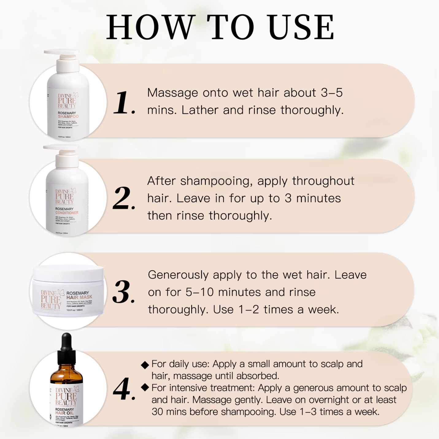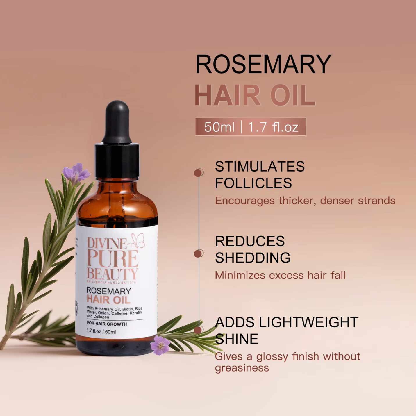 Divine Pure Beauty Hair Oil features a refined rosemary-infused formula blending natural ingredients like rosemary, jojoba seed oil, tea tree oil, rice oil, onion oil, and caffeine. This harmonious combination supports hair growth, helps prevent hair loss, and enhances scalp circulation for healthier, more vibrant hair. Enjoy the luxurious feel of silky smooth strands while nourishing your scalp with nature’s best.